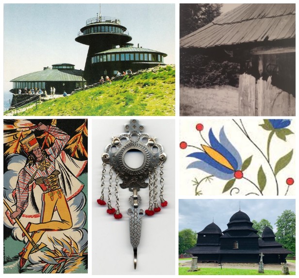 Widoczne na zdjęciu motywy wpisują się w trójkątną blachę przewodnicką. Większość z nich zaprojektował wszechstronny artysta Janusz Jutrzenka Trzebiatowski: stylizowana wizja podhalańskiej spinki (SKPG Kraków), schronisko na Śnieżce (SKPS Wrocław), stylizowana cerkiew bojkowska (SKPB Warszawa), motyw nawiązujący do haftu kaszubskiego szkoły żukowskiej (SKPT Gdańsk). Pozostałe dwie blachy przedstawiają tańczącego harnasia (SKPG „Harnasie” Gliwice) projektu Andrzeja Mokrosza oraz bacówkę z Polany Stawieniec pod Kudłoniem (SKPB Katowice), pomysłodawcą ostatniej był Edward Kudelski, a zaprojektował ją Henryk Jasiński.