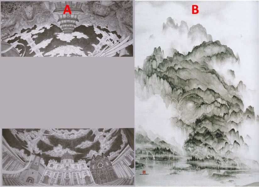 Spójrzcie na obraz A, a raczej fragment, który udostępniliśmy. To przykład w którym mieszają się wątki religijne i kulturowe dwóch krańców świata, np. połowa nieba utrzymana jest w duchu sztuki wschodniej, połowa zaś przedstawia obłoki z perspektywy zachodu. Autor tak sprytnie wymyślił to połączenie, że aż wygrał Grand Prix prestiżowej uczelni, przez które dzieło nigdy nie zagości na polskiej ziemi. No dobrze, przez chwilę kopię można było zobaczyć w pewnym muzeum przenikniętym duchem sztuki wschodniej. Specjalnie dla Was delikatnie zmodyfikowaliśmy obraz, by nie zdradzać zbyt wiele, np. o tytule dzieła.